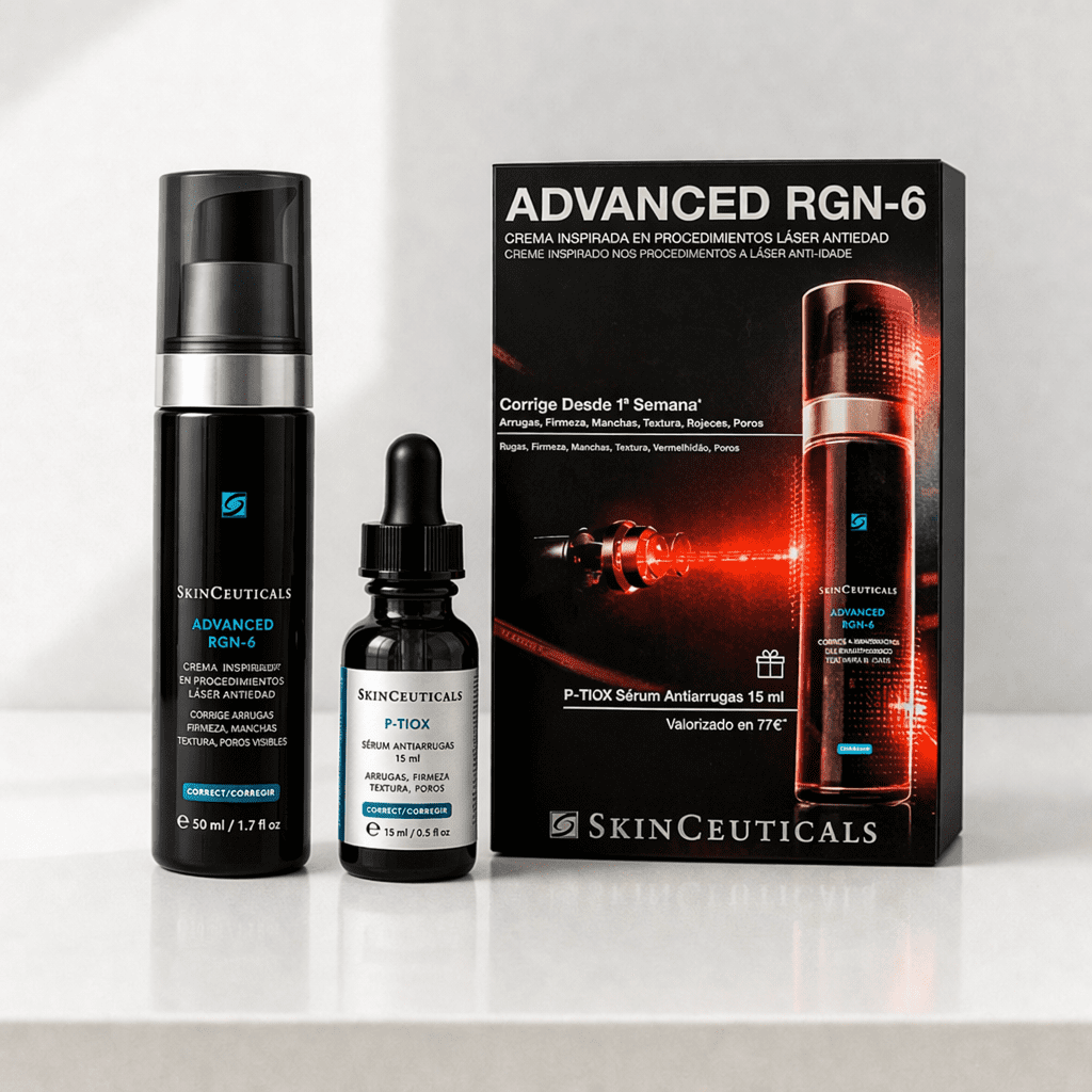 El Pack Advanced RGN-6 Crema + Sérum P-TIOX – SkinCeuticals es un tratamiento antiedad avanzado que combina dos fórmulas complementarias para mejorar visiblemente los signos del envejecimiento cutáneo.