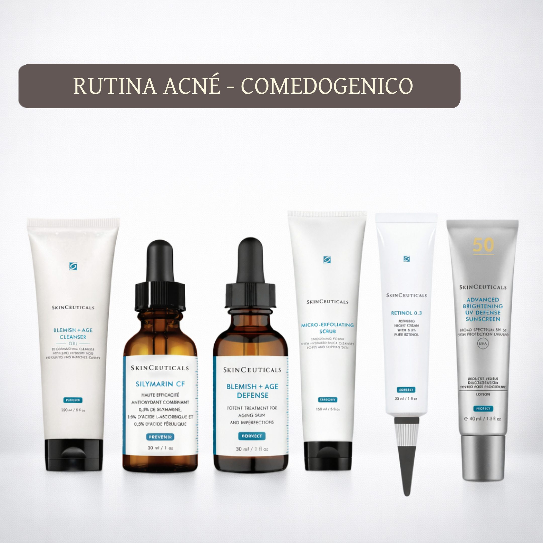 Esta rutina incluye: Blemish + Age Cleanser, Silymarin CF, Blemish + Age Defense, Micro-Exfoliating Scrub, Retinol 0.3 y Advanced Brightening UV Defense SPF 50.
